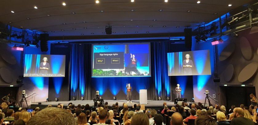 In July 2019, Maartje gave a one-hour keynote presentation at the World Congress of the World Federation of the Deaf (WFD) in Paris: “Sign language rights for all, and forever?”. The full presentation in International Sign is available here, as well as the slides. The keynote was based on a presentation she gave a few months before at a conference in Oslo, although the beginning and end of the presentation were different, and some of the arguments were finetuned. Andy interpreted this presentation.